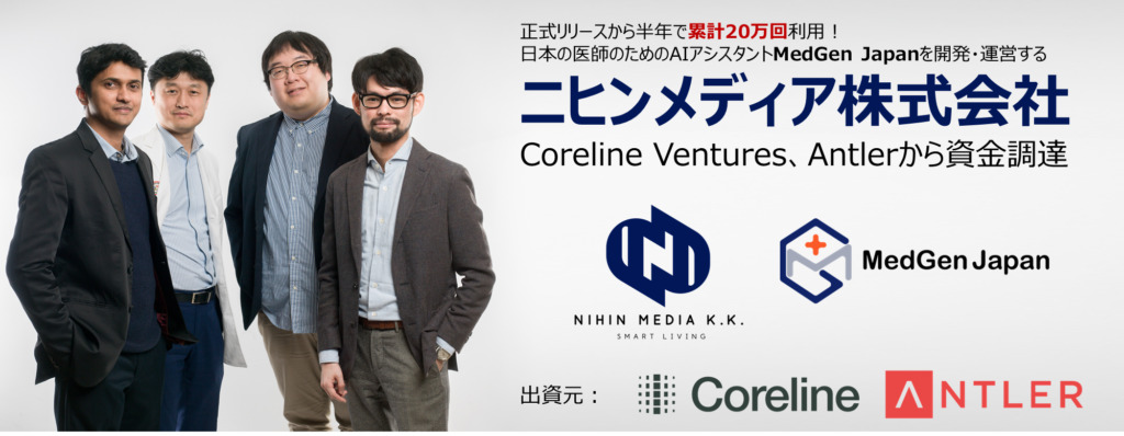 ニヒンメディア株式会社は、日本の医師向けAIアシスタント「MedGen Japan」の開発・運営を行うにあたり、2025年Q4にCoreline VenturesおよびAntlerを引受先とする第三者割当増資による資金調達を実施しました。